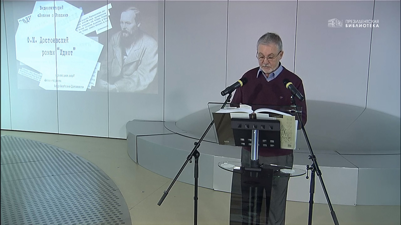 В рамках видеолектория Президентской библиотеки «Знание о России» состоялась третья по счету лекция из цикла, посвященного жизни и творчеству Ф. М. Достоевского. Тема этой встречи – «Поиски Ф. М. Достоевским главного героя романа «Идиот» на материале черновых записей писателя».