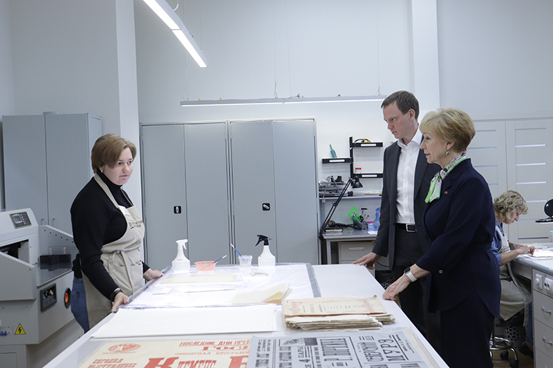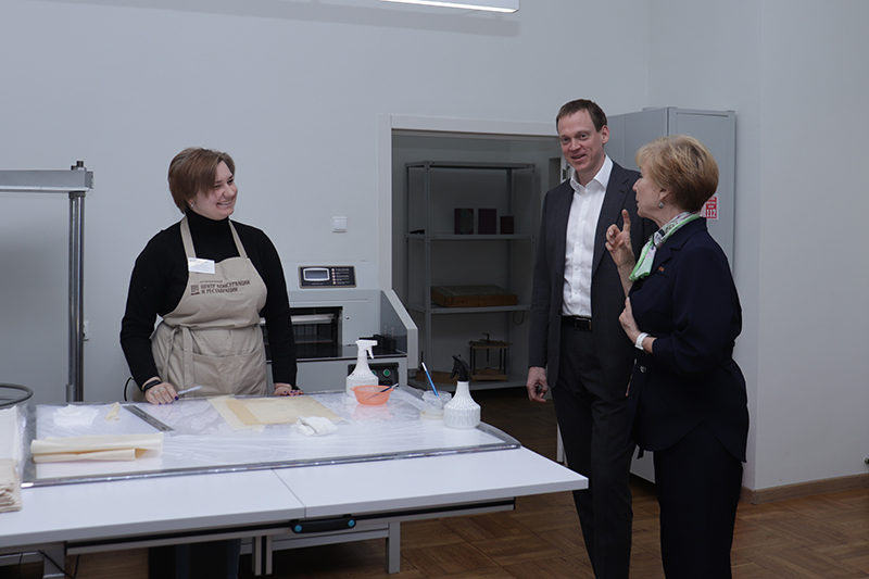Директор библиотеки имени Горького Наталья Гришина провела экскурсию по центру. Губернатор выразил заинтересованность процессами реставрации. Павел Малков побеседовал с сотрудниками, осмотрел лабораторию, мастерские, обсудил вопросы дальнейшего развития регионального центра.