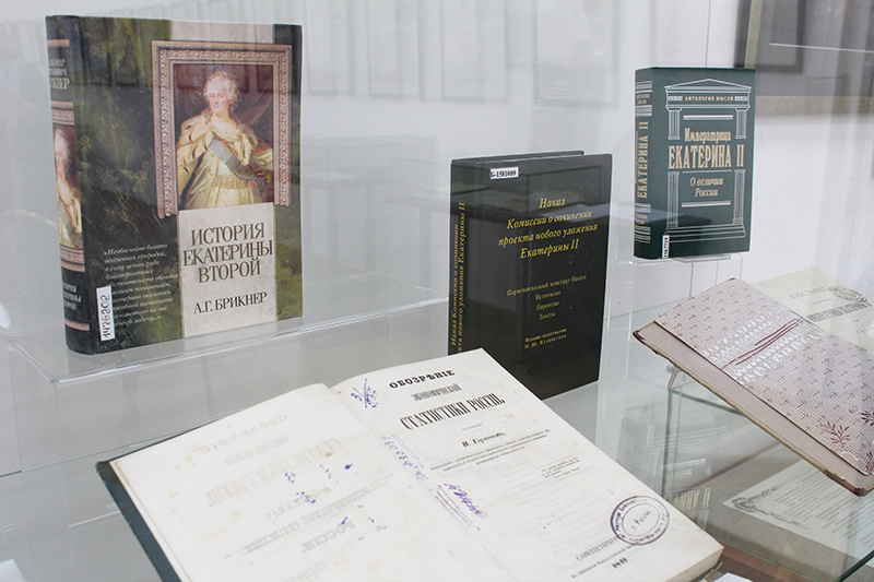 Рязанская областная библиотека имени Горького и Рязанский историко-архитектурный музей-заповедник представили в экспозиции библиографию по тематике выставки, начиная с сочинений Н.М. Карамзина, С.М. Соловьёва и В.О. Ключевского. Труды А.Г. Брикнера, Ю.В. Готье, А.Д. Градовского, А.В. Лохвицкого, А.А. Кизеветтера, Б.Н. Чичерина посвящены исследованию роли государства в развитии страны и жизни населения. Период правления Екатерины II и ее реформаторская деятельность занимают особое место во всех работах. Советские историки П.Г. Рыдзюнский, Б.Н. Миронов, А.Б. Каменский посвятили свои труды изучению проблем русского города, городской промышленности и городского самоуправления XVIII в. и уделяли огромное внимание деятельности Екатерины II. В постсоветский период среди многочисленных работ выделяются монография Н.И. Павленко «Екатерина Великая» и источниковедческое исследование Н.В. Середы «Реформа управления Екатерины II».