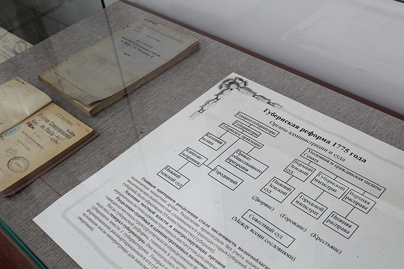Об истории создания Рязанской губернии рассказывают представленные на выставке подлинные документы эпохи правления Екатерины II из Государственного исторического архива РФ: Именной указ императрицы Екатерины II данный Пр. Сенату от 28 февраля 1778 г. об учреждении Рязанской губернии, Именной указ императрицы Екатерины II данный Пр. Сенату от 24 августа 1778 г. об учреждении Рязанского наместничества и др.
