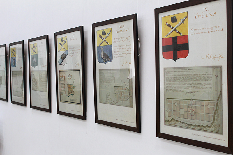 Центральное место в экспозиции занимают геометрическая карта Рязанского наместничества 1791 г., рисунки гербов и планы городов Рязанского наместничества 1780-х гг.
