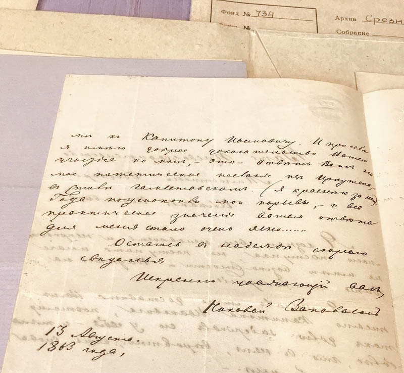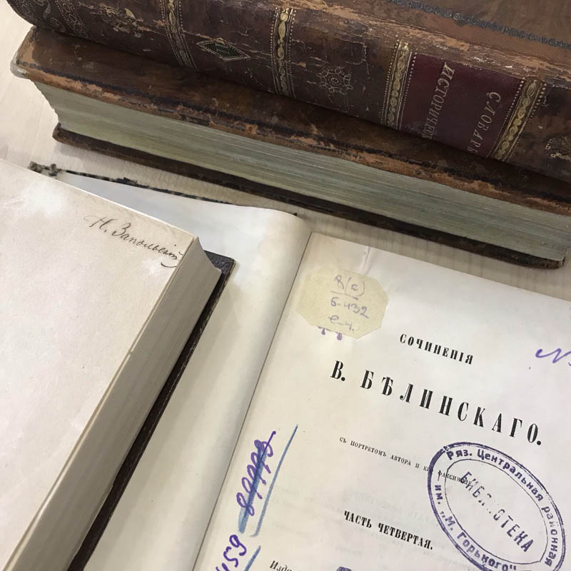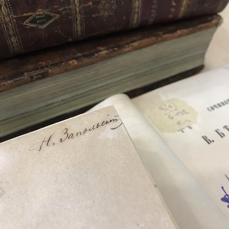 В фондах Горьковки сегодня хранится три книги из личной библиотеки Николая Запольского, отражающие его профессиональные интересы и увлечение отечественной историей. Это один из томов «Сочинений» Виссариона Григорьевича Белинского, изданных в Москве в 1859–1862 годах, «Чтение из русской истории (с исхода XVII века)» Петра Карловича Щебальского, опубликованное в Петербурге в 1861 году, и «Записки о Московии» барона Сигизмунда фон Герберштейна, переведенные Иваном Николаевичем Анонимовым и выпущенные в Петербурге в 1866 году.