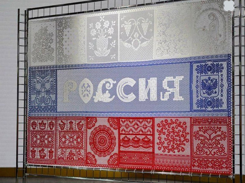 Масштабное панно в рамках акции «Кружево России» размером 2 на 3 метра выполнено в цветах российского флага и с символикой выставки. Его почти пять месяцев создавали кружевницы из восьми субъектов РФ: Рязанской, Вологодской, Ярославской, Нижегородской, Липецкой, Кировской и Ленинградской областей, а также Санкт-Петербурга. Это регионы, где сохранено искусство кружевоплетения на коклюшках. Каждый фрагмент уникален, он отражает стилистические особенности регионального кружева: кировского, елецкого, балахнинского, рязанского и других. Вместе они составляют общую композицию, объединенную любовью к Родине, традициям и ремеслу.
