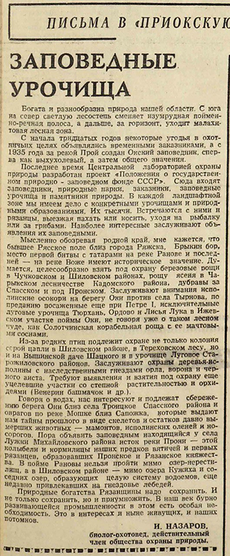 Легендарный рязанский натуралист Иван Павлович Назаров рассказал о совместных поездках с Виктором Павловичем Иванчевым, заместителем директора по научной работе Окского заповедника, в Михайловский район для наблюдения за гнездованием цапель. Фотосъемки производились в сложнейших условиях: многочасовое стояние в скрадке – по грудь в воде, в резиновом костюме, защищенном брезентовым фартуком от порезов острыми листьями тростника. Исследователи убедились, что бдительные птицы отлично умеют считать до двух, и были вынуждены подбираться к укрытию возле гнезда, прячась в лодке под навесом, чтобы не было понятно – сколько человек сначала приплыло в лодке, а сколько в ней осталось через пять минут. Результат – изумительные фотографии серой цапли с лохматыми светлоглазыми птенцами, который впервые были показаны всем, кто подключился к трансляции встречи. Уже более полувека Иван Павлович изучает природу Рязанского края, одну из самых ранних его публикаций о защите колоний цапель можно прочитать в заметке в «Приокской правду» (№ 9, 1971).