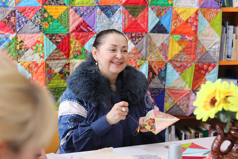 Собравшиеся рукодельницы в течение двух часов кропотливо сшивали и стегали кусочки будущего одеяла, а в это время звучал рассказ руководителя проекта Елены Васильевны Венедиктовой о возникновении первой иголочки, об истории лоскутного творчества, о творчестве С.А. Есенина. Интересно, что почти в каждом районе была присущая только ему лоскутная техника. Так, лоскутное творчество Рыбновского района схоже с народным блоком «изба», но есть и такие районы, традиции лоскутного творчества которых утеряны и еще требуют тщательного изучения.