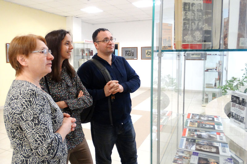 Сотрудник библиотеки В.А. Буковская провела для гостей из посольства познавательную экскурсию по экспозиции «Революция в России: взгляд черед столетие», на которой представлены документы из фонда РОУНБ им. Горького и фотографии из фонда РИАМЗ.