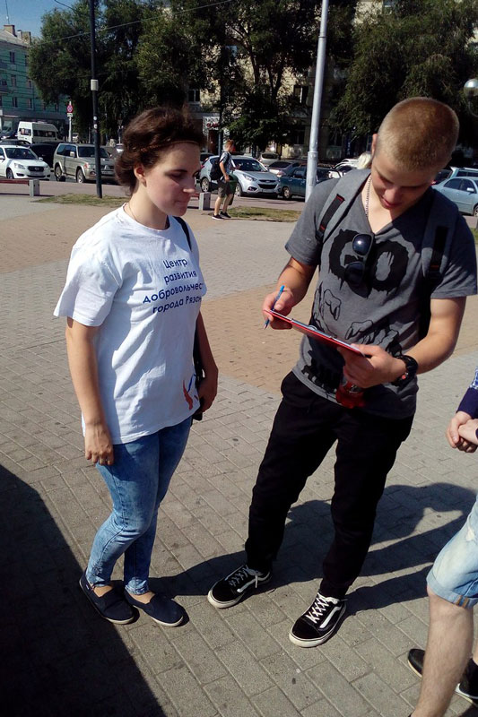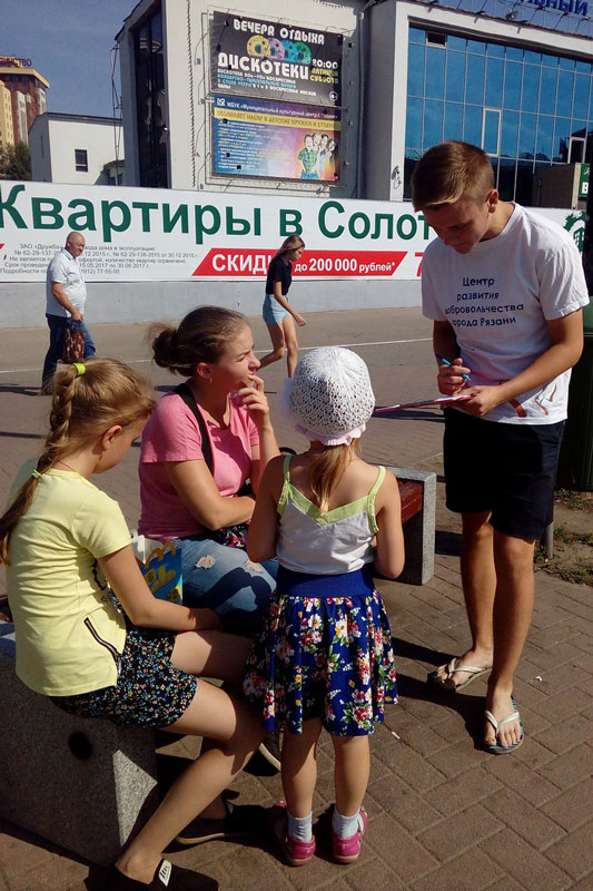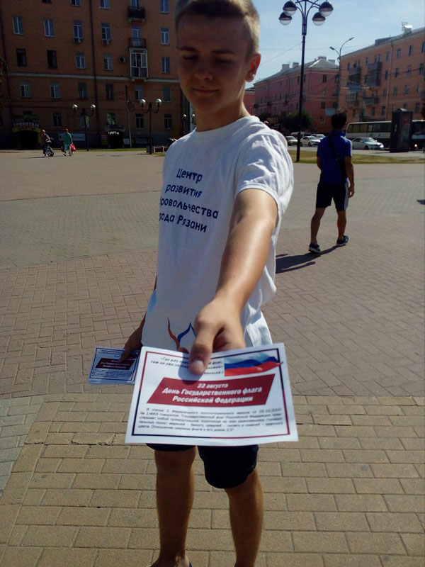 В рамках акции «Флагу России – виват!» на площади Победы волонтеры Центра развития добровольчества города Рязани вручали горожанам флаеры, подготовленные сотрудниками библиотеки, рассказывающие о государственном символе. Там же было проведено анкетирование на тему «Знаешь ли ты свой флаг?». Анализ анкет показал, что треть опрошенных ответили на все вопросы и знают все символы российского государства. И почти 100 процентов респондентов уверенно заявили, что триколор – бело-сине-красный и у него есть свой день.