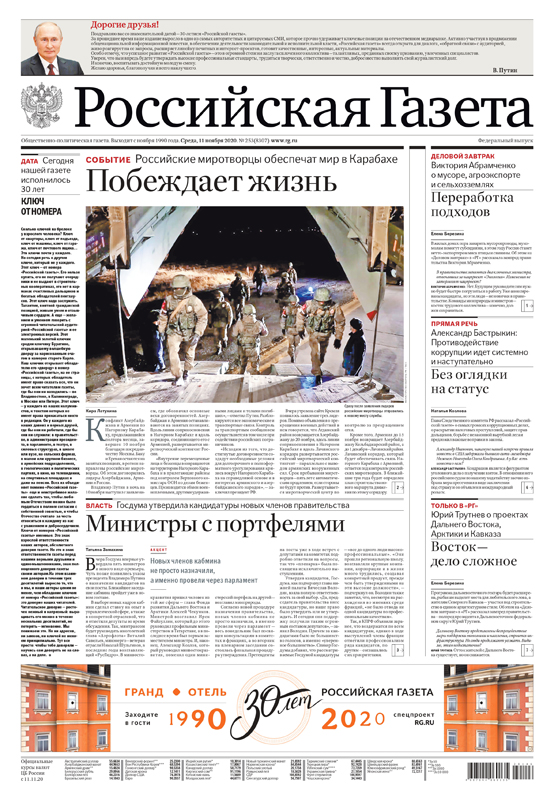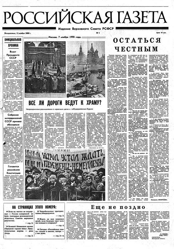 «Российская газета» – официальный печатный орган Правительства Российской Федерации. 11 ноября 1990 г. тиражом 200 тыс. экземпляров вышел первый номер газеты, основанный Верховным Советом РСФСР. В 1993 году учредителем газеты стало Правительство РФ.