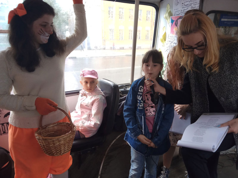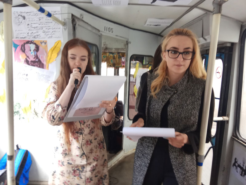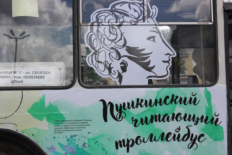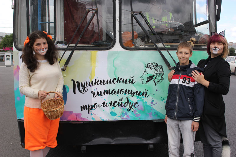 На несколько часов троллейбус маршрута № 3 превратился в литературную площадку, на которой звучали стихи Александра Сергеевича и факты из его биографии. В роли «праздничного» кондуктора выступал Кот ученый – знаменитый литературный герой, а помогала ему Белка-затейница. В отличие от обычного кондуктора они не собирали плату за проезд (он был абсолютно бесплатным), а раздавали «золотые орешки» всем участникам акции. Пассажиры тоже имели возможность прочитать пушкинские стихи, выступив у «Свободного микрофона».