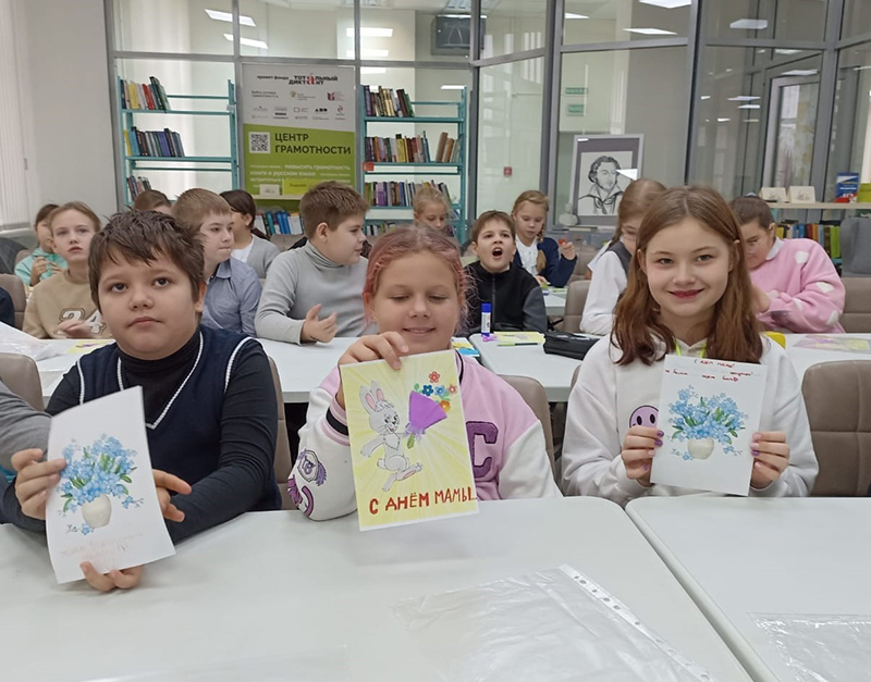 Мама, мамочка! Так мы называем самого близкого, дорогого человека, любовь которого греет нас всю жизнь. Мама заботится о нас, учит нас мудрости, дает советы в сложных жизненных ситуациях. Библиотекари познакомили школьников с историей праздника. Прозвучали стихотворения Агнии Барто, Елены Благининой, Эдуарда Успенского и других авторов. Ребята поучаствовали в шуточных конкурсах, викторине, вспомнили пословицы и поделились рассказами о том, как они помогают мамам. С желанием порадовать самого близкого и любимого человека – маму – юные читатели сделали открытки с теплыми поздравлениями к празднику.