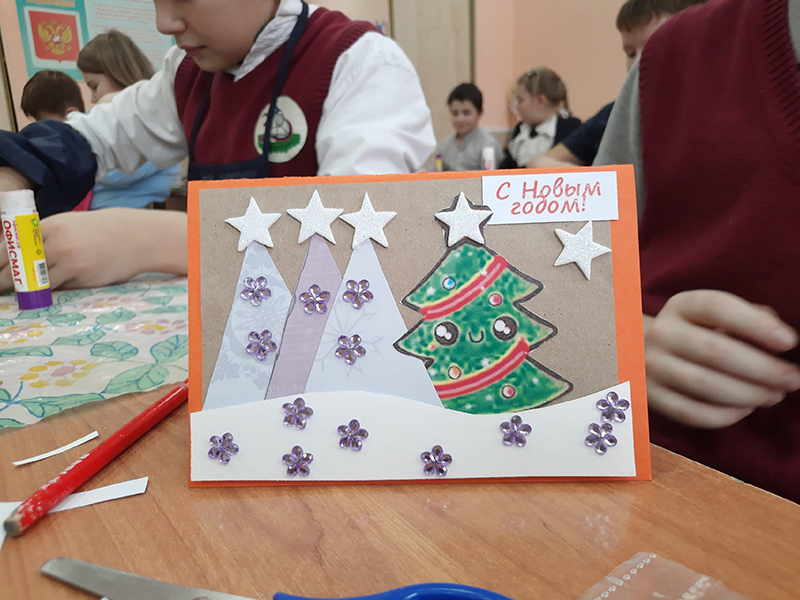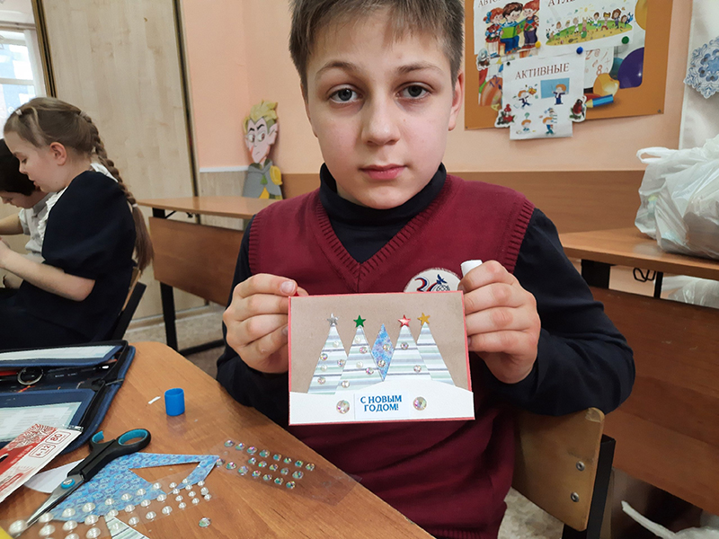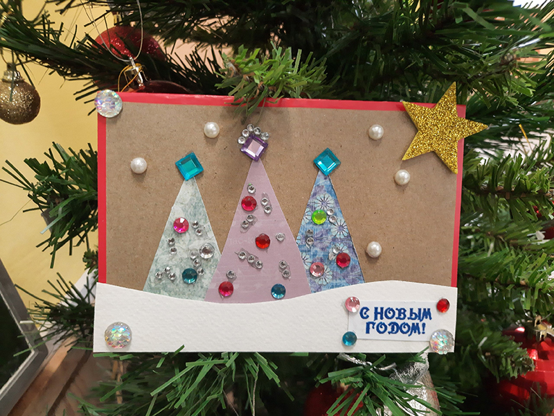 Мальчишки и девчонки признались, что их самый любимый праздник – Новый год. В этот день хочется сказать приятные слова близким и родным, пожелать много радости и счастья, подарить что-то особенное. Всё это можно сделать с помощью рукодельной открытки. Дети с удовольствием окунулись в творчество, смогли проявить свою креативность и фантазию, создавая необычные ёлочные композиции с помощью дизайнерской бумаги и декоративных украшений.