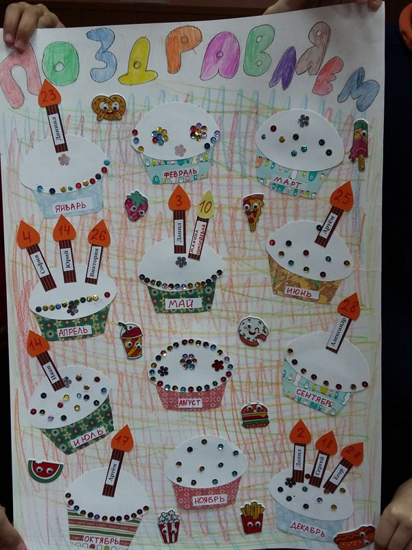 Каждый календарный месяц ребята представили в виде праздничного кекса, а на свечках написали свои имена. С большим увлечением они украшали импровизированные кексы сладостями, клеили таблички, конструировали свечи, раскрашивали буквы. Надеемся, что такая работа поможет ребятам не забыть о важных днях и сплотит еще больше этот маленький дружный коллектив.