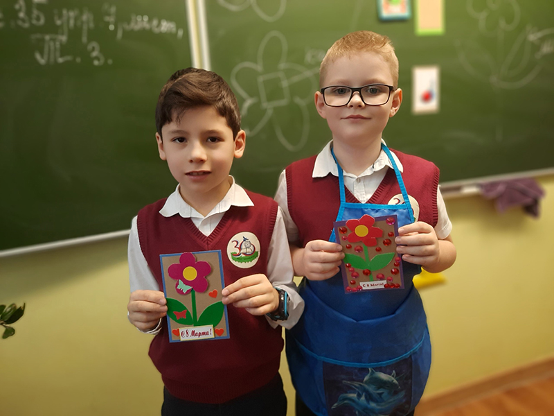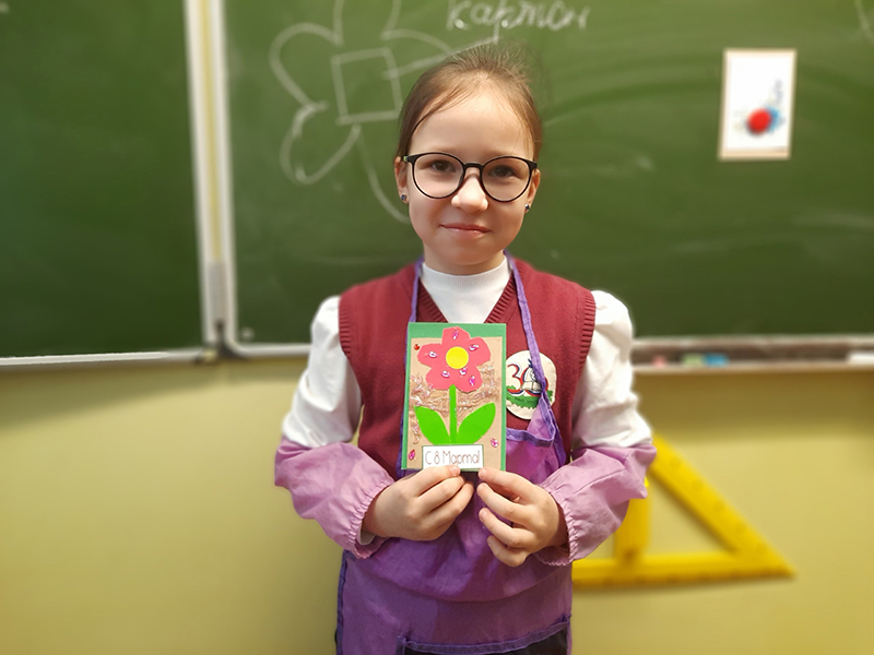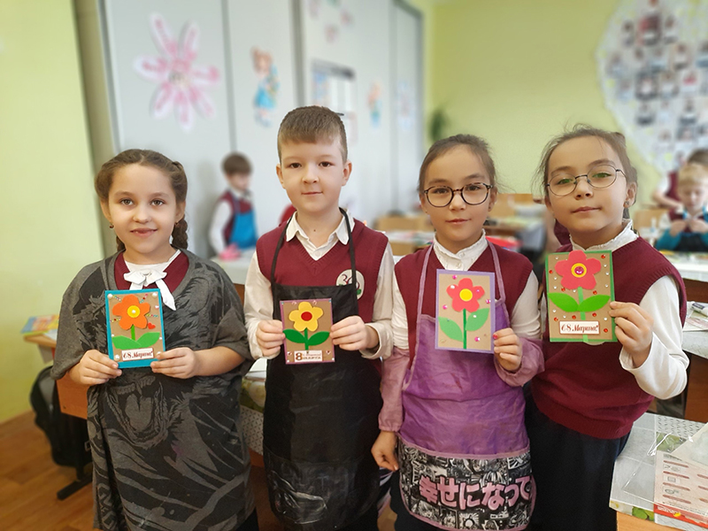 Героем открытки стал маленький цветок, который ребята вырезали по шаблону из цветного картона и украсили каждый по своему вкусу. Все работы мальчишки и девчонки сопроводили теплыми словами поздравлений в адрес своих близких.