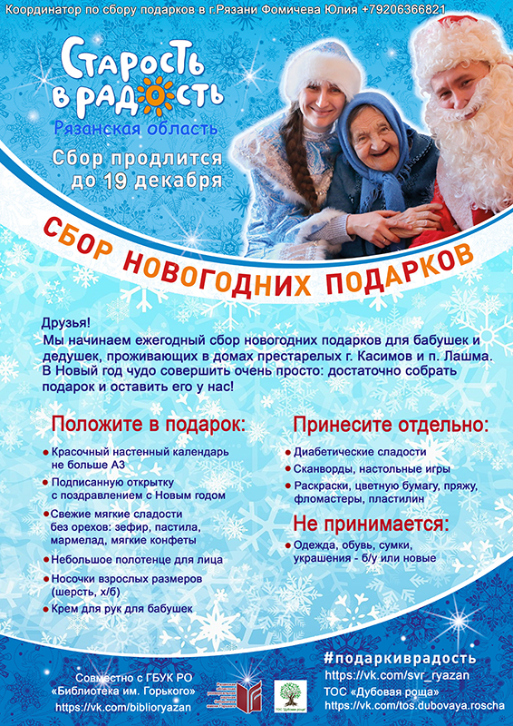 Волонтерское движение «Старость в радость. Рязанская область» при поддержке региональной Ассоциации органов ТОС и библиотеки имени Горького вновь объявляют старт сбора новогодних подарков для одиноких бабушек и дедушек, проживающих в домах престарелых города Касимова и Касимовского района нашей области.