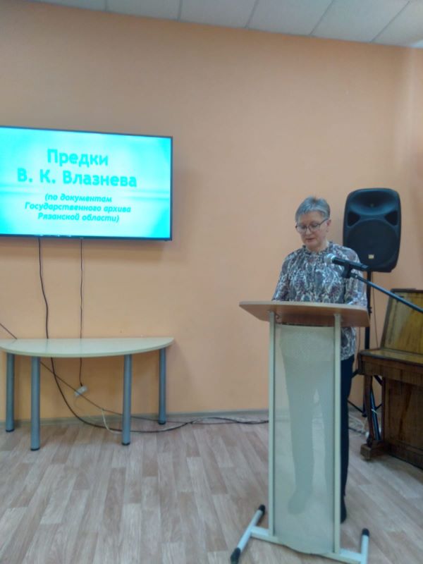 С докладом «Предки В. К. Влазнева (по документам Государственного архива Рязанской области)» выступила главный библиограф краеведческого информационного отдела Рязанской областной универсальной научной библиотеки им. Горького О. Я. Азовцева.