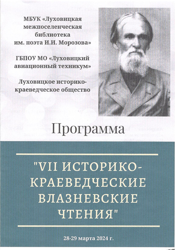29 марта в стенах Луховицкой межпоселенческой библиотеки им. поэта И. И. Морозова состоялась историко-краеведческая конференция «VII Влазневские чтения», посвященная 185-летию со дня рождения краеведа, журналиста, поэта Василия Кузьмича Влазнева (1839–1905), уроженца села Верхний Белоомут Зарайского уезда Рязанской губернии (ныне Луховицкий район Московской области).