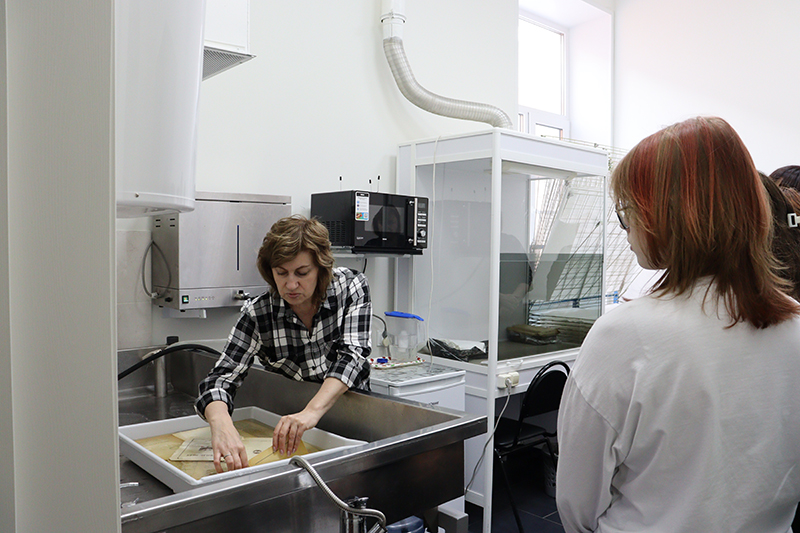 Участники экскурсии получили возможность увидеть и даже частично повторить некоторые этапы сложной работы. Реставрация представляет собой целую систему последовательных действий, требующих не только глубоких знаний, но и невероятного терпения и аккуратности. Сотрудники центра продемонстрировали процесс промывки документов, удаленного увлажнения, применяемого для сильно поврежденных документов. Вниманию гостей была представлена классическая листовая реставрация с использованием специальной реставрационной бумаги. Гости познакомились с материалами, инструментами и оборудованием, используемыми в реставрационных и переплетных работах.