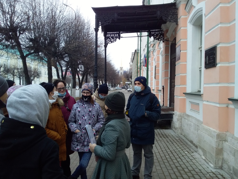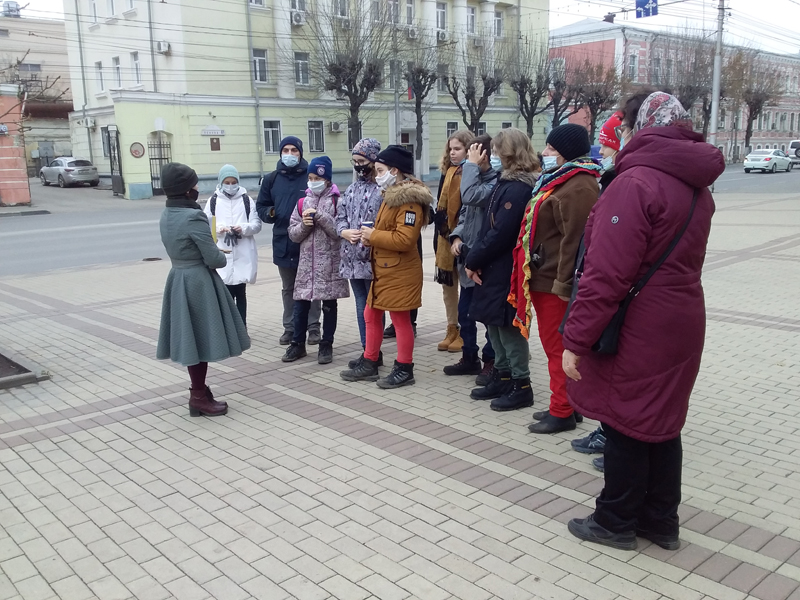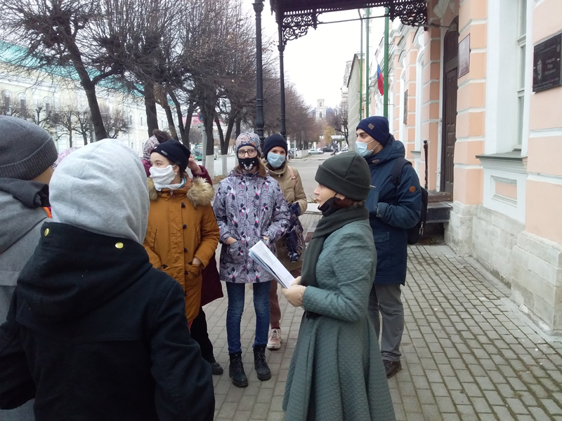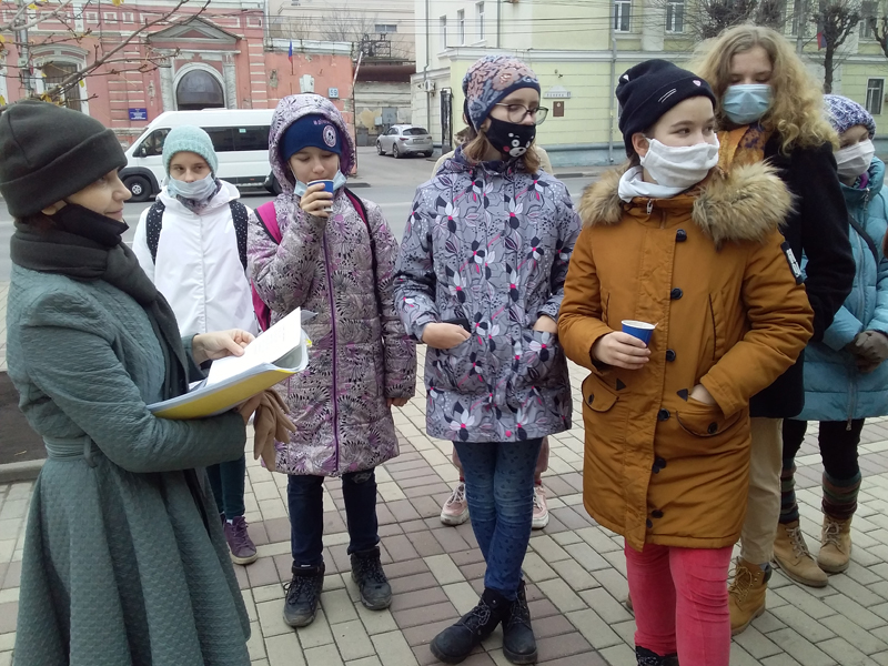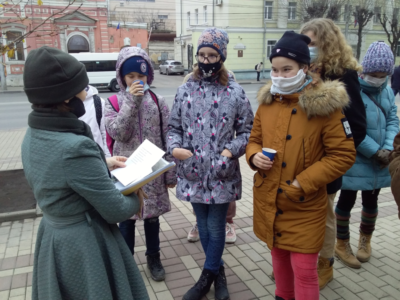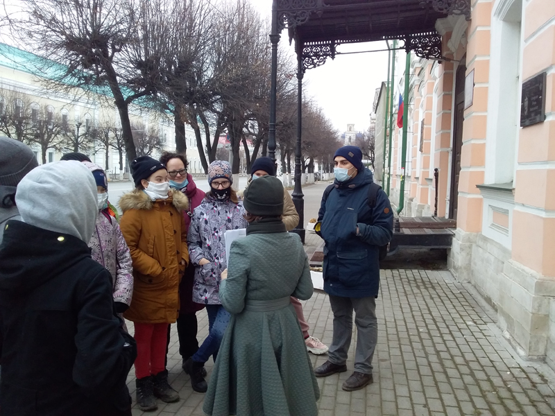 Возле Театра на Соборной ребята выяснили, где находился первый Рязанский оперный театр, кто чаще всего выступал на провинциальной сцене, как описывал жизнь крепостных актеров Александр Грибоедов.