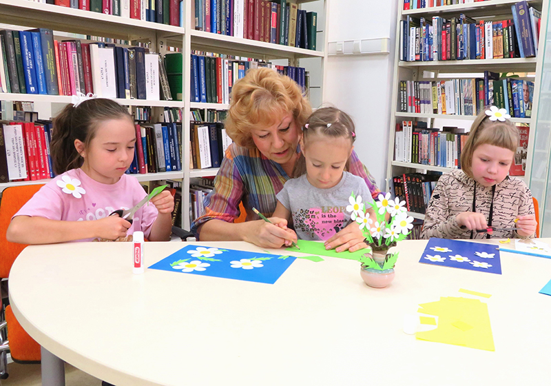 Участники мастер-класса под руководством библиотекаря, используя цветной картон, белую бумагу, бамбуковые шпажки, атласные ленты, клей-карандаш и ножницы, активно потрудились. Декоративные панно и открытки, цветочные композиции и кулоны-подвесы, выполненные с душой и любовью, подняли настроение детям и родителям.
