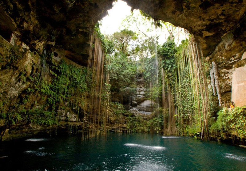 Этот колодец (майя называли его «сенот») – глубокая яма, заполненная подземными водами, – имел естественное происхождение и находился среди крутых, почти отвесно падающих скал высотой до 20 метров. Примерно на такую же глубину темная вода уходила в толщу земли. Возраст его определяют примерно в две тысячи лет. Когда-то тут была подземная пещера.