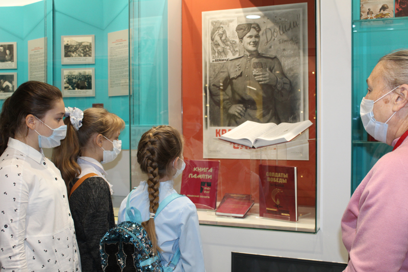 Библиограф краеведческого информационного отдела Н. А. Беседина познакомила школьников с документально-выставочным проектом, отражающим роль Рязанского края в годы Великой Отечественной войны (1941-1945 гг.). Учащиеся школы № 1 узнали о рязанцах, вынесших тяжесть первых дней войны, тружениках тыла, партизанах, героях, повторивших подвиг А. М. Матросова. Наталья Алексеевна отметила, что в годы войны библиотека не закрывалась и пополнялась новыми книгами.