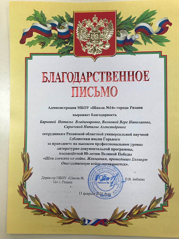 В ознаменование 80-летия Победы в Великой Отечественной войне Указом Президента Российской Федерации 2025 год объявлен Годом защитника Отечества. В преддверии великой даты для учащихся 11-х классов школы № 16 сотрудники библиотеки имени Горького провели литературно-документальную программу «Шли девчата по войне. Женщинам, прошедшим Великую Отечественную войну, посвящается».