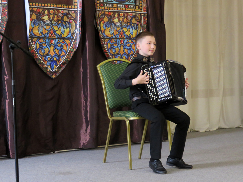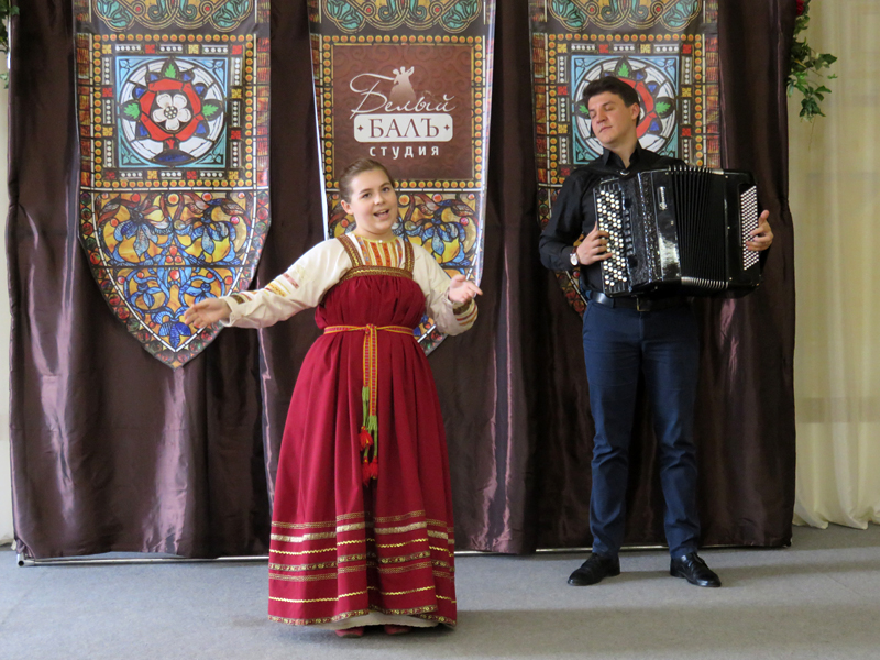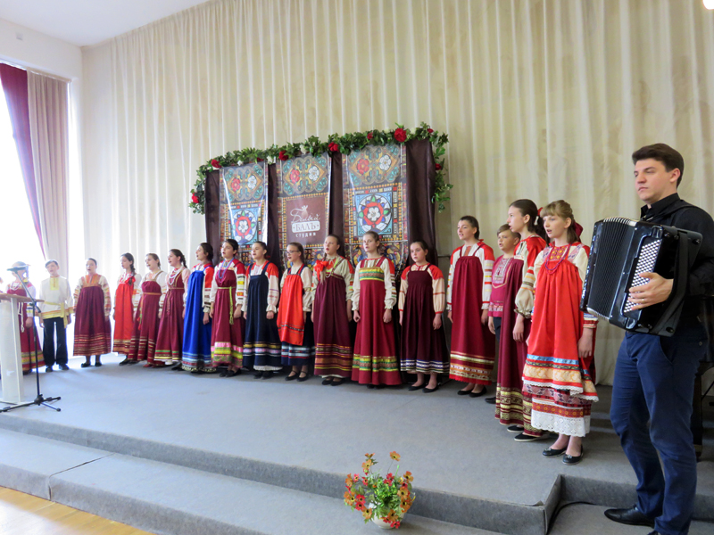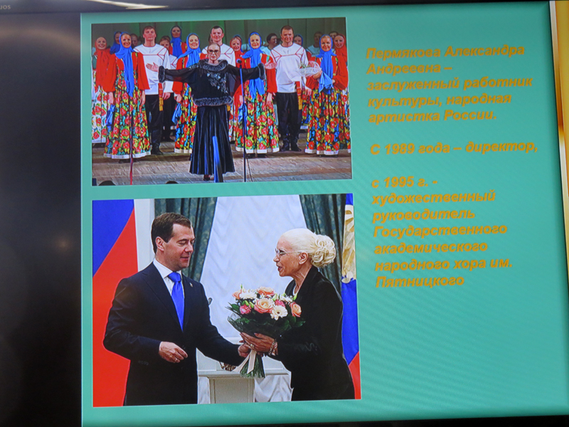 В концертной части программы прозвучали любимые уже не одним поколением слушателей песни из репертуара Государственного академического русского народного хора им. М.Е. Пятницкого: «Кому радость», «Ой, то не вечер, то не вечер», «По диким степям Забайкалья», «Провожание», «Ой вставала я ранешенько», «Ой туманы мои, растуманы» и другие. В концерте приняли участие фольклорный ансамбль «Горница» и его солистка Мария Левакова (руководитель – Оксана Матыгина, концертмейстер – Дмитрий Сычев), учащиеся школы Артем Поскряков (преподаватель – Н.А. Ряховская) и Владислав Брешенков (преподаватель Л.В. Ефимова). Яркий, содержательный рассказ ведущей, живая музыка, великолепная видеопрезентация, предоставившая уникальную возможность услышать в исторической ретроспективе записи выступлений прославленного хора, оставили неизгладимое впечатление.