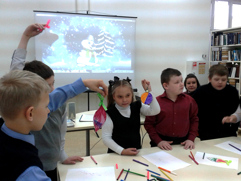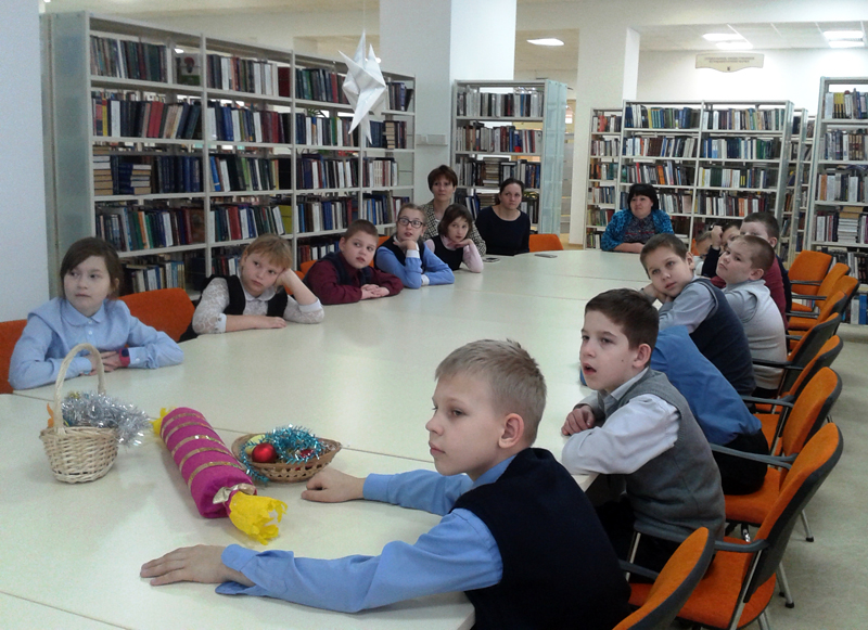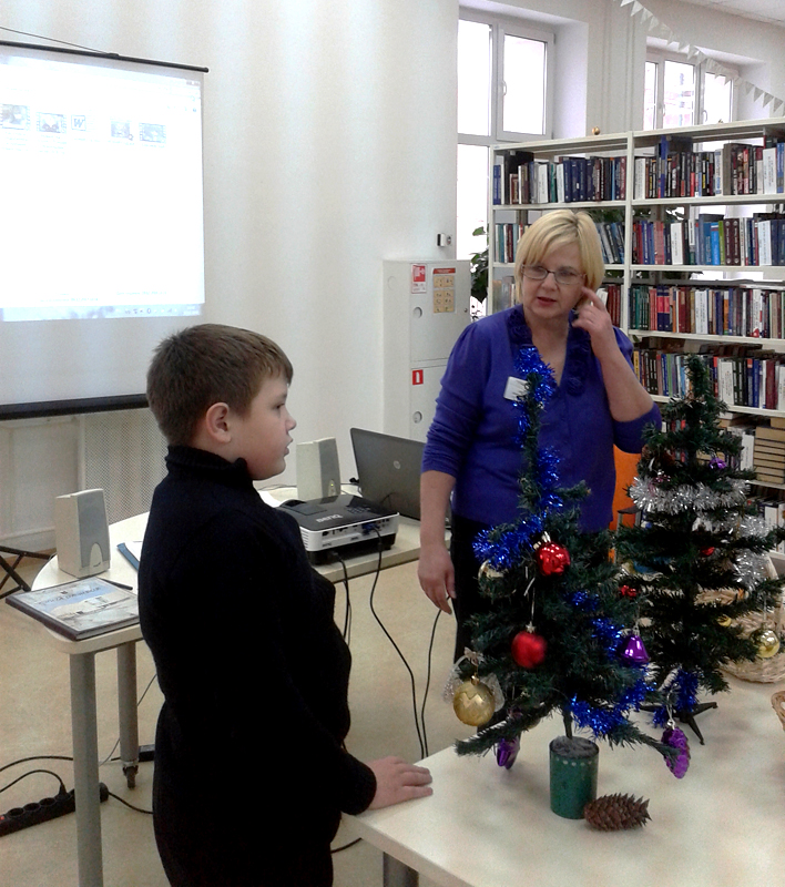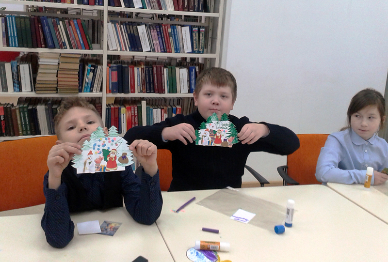 Юные читатели познакомились с историей празднования Нового года на Руси: узнали, как украшали елочку, как появились новогодние игрушки, откуда родом снеговик. Дети с удовольствием участвовали в конкурсах «Елочка нарядная, светятся огни», «Разноцветные игрушки», «Кто быстрее попадет на праздник». С хорошим настроением ребята делали открытки в форме новогоднего дерева. Праздничные сувениры получились яркими. Ребята приготовили их для своих родных и близких к новогоднему празднику.