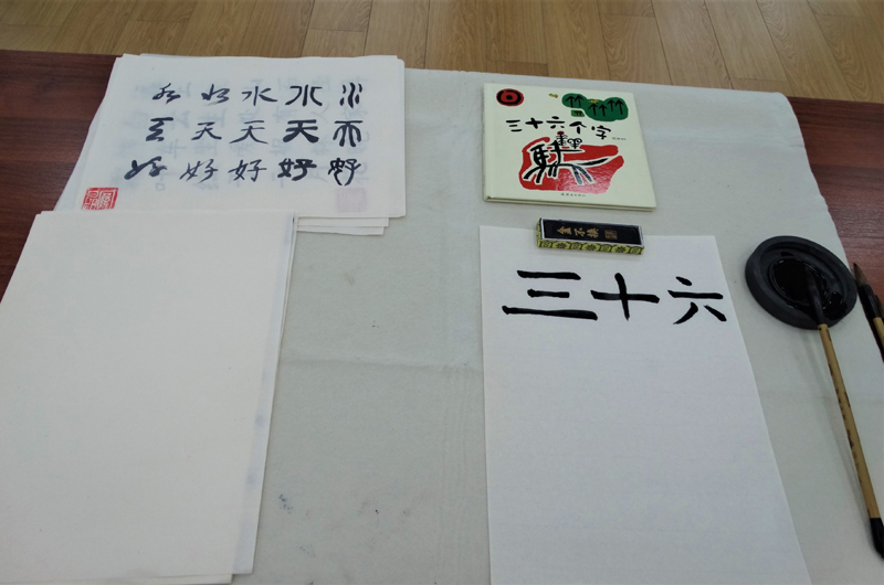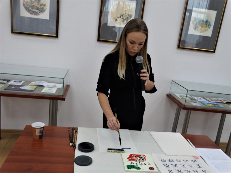 Завершил открытие выставки мастер-класс по книге «36 иероглифов» от ведущего специалиста по учебно-методической работе Института Конфуция РГУ имени С.А. Есенина Анастасии Запрудновой. Мастер-класс познакомил присутствующих с историей происхождения и развитием китайской письменности, с пятью основными стилями китайской каллиграфии, а также позволил желающим попробовать самостоятельно изобразить простейшие элементы иероглифов.