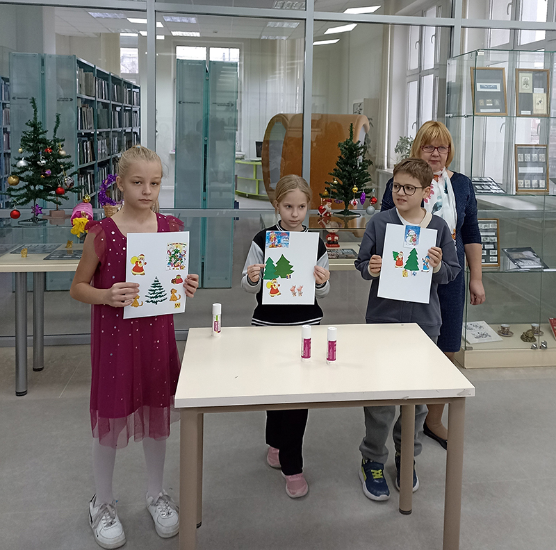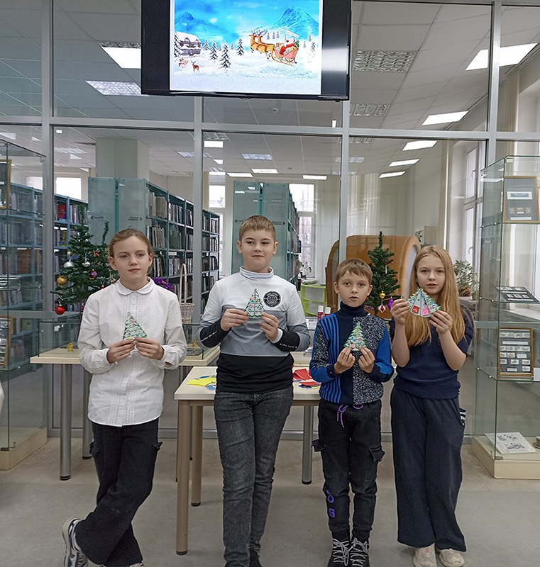 Юные читатели поучаствовали в конкурсах, ответили на вопросы шуточной викторины и смастерили из бумаги елочную игрушку-открытку к празднику.