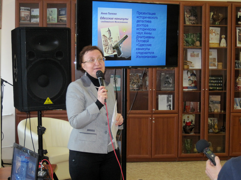 На заседании клуба Анна Дмитриевна представила свою новую книгу «Одесские каникулы следователя Железманова». Очередной роман, написанный в жанре исторического детектива, продолжает повествование о молодом следователе Петре Андреевиче Железманове.
