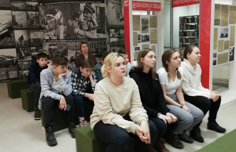 Час истории проходил в зале, где в настоящее время открыта выставка «Вехи Великой Победы». Ребята познакомились с публикациями из газет 1945 года, увидели подлинные награды Великой Отечественной войны, фотографии и другие документы. По окончании мероприятия молодые люди написали в отзыве: «Низкий поклон за память, которую вы передаете. Наше поколение подростков очень нуждается в этой памяти, чтобы война не повторилась».