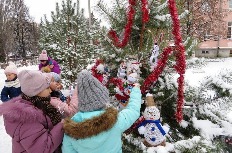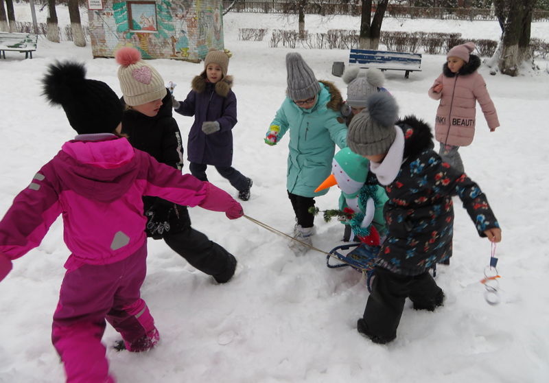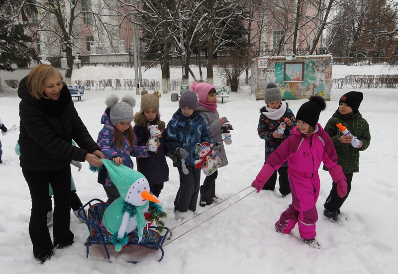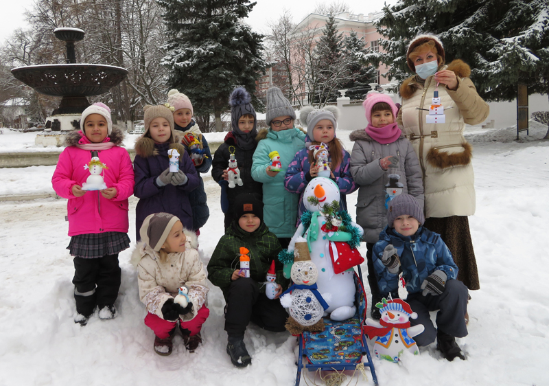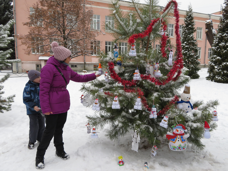 Снеговик – один из любимых детских персонажей взрослых и детей. Сделать его под Новый год своими руками – приятное событие. Большой объёмный снеговик, выполненный из ватмана, текстиля, пластика и цветной бумаги смотрелся очень привлекательно. Зрелищно выглядело и катание снеговика на санках. Красивой и весёлой получилась и молодая сосна, украшенная фигурками снеговиков, подготовленными детьми и их родителями для праздника. Ребята с удовольствием демонстрировали «снеговичковую ёлочку» прохожим.
