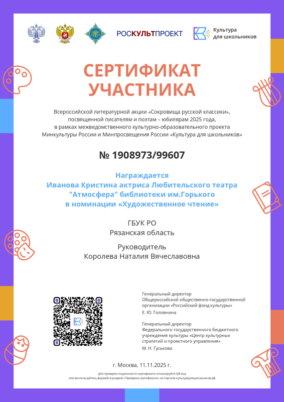 Мероприятие прошло в рамках проекта «Культура для школьников» и собрало более 15 000 ребят со всей России. Творческое соревнование стало настоящей площадкой вдохновения: участники читали вслух стихи и прозу, ставили яркие театральные спектакли, сочиняли собственные литературные произведения и снимали увлекательные видеоролики, посвященные знаменитым русским писателям и поэтам.
