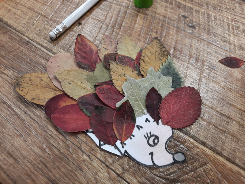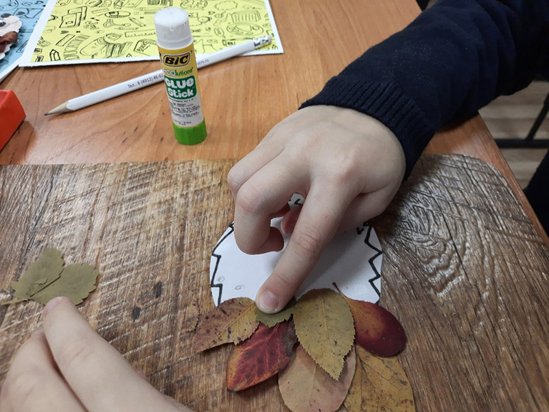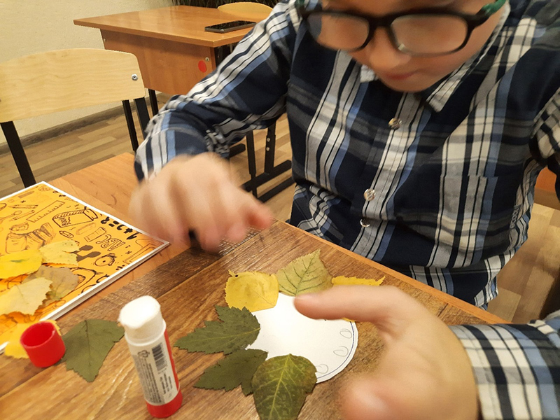 Ребятам предложили в качестве основного материала использовать высушенные осенние листья. Работа с гербарием требует особой сноровки и аккуратности, ведь сухие листья нежные и хрупкие. Каждый листочек нужно было наклеивать на шаблон очень тщательно, не задевая предыдущего листа.
