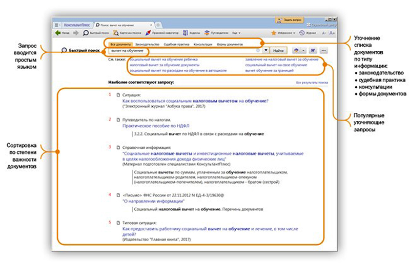 Самое главное для пользователя – быстро найти в системе нужный документ. СПС «КонсультантПлюс» постоянно развивается, добавляя новые возможности поиска, тем самым предоставляя пользователям современные и удобные возможности работы с правовой информацией.