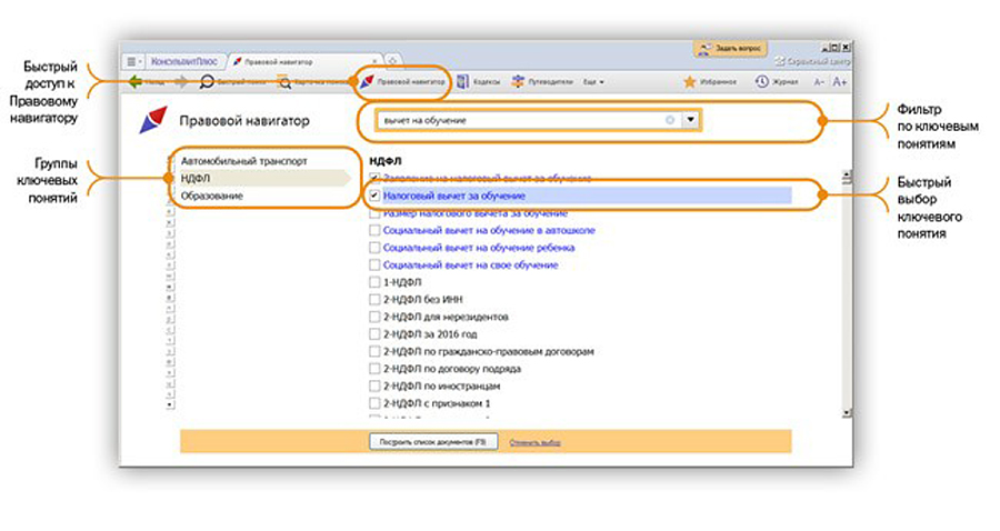 Правовой навигатор удобно использовать, если сложно сформулировать поисковый запрос и можно назвать несколько слов, относящихся к ситуации. При этом не требуется указание реквизитов документов, а фильтр позволяет быстро найти нужное понятие и тем самым сузить область поиска.