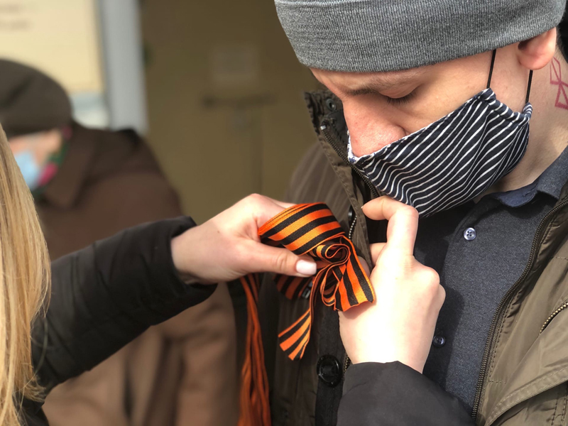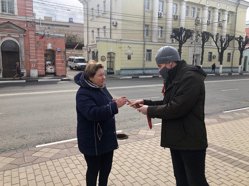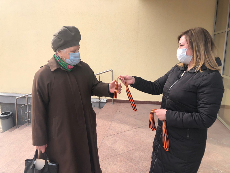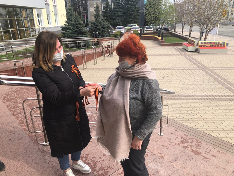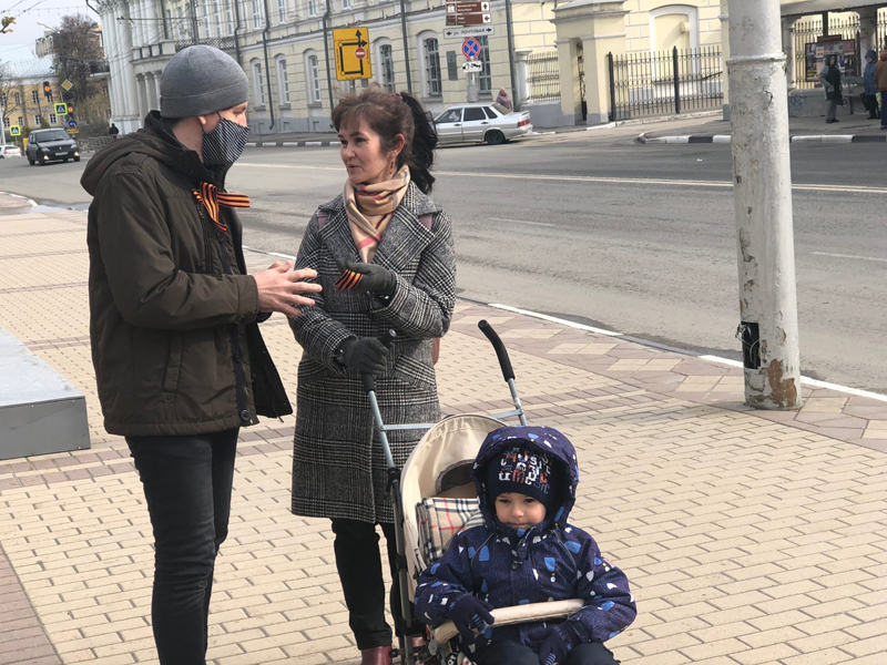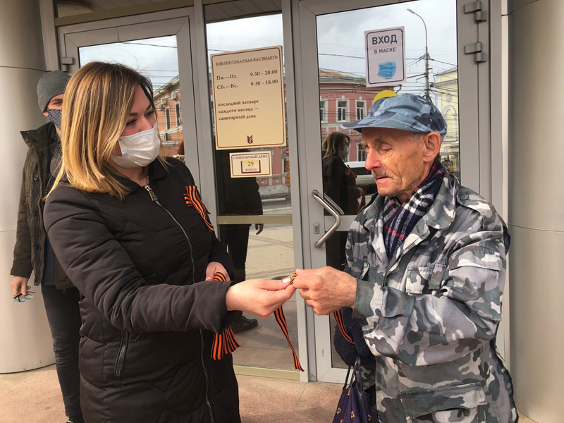 Первыми символ уважения к памяти победителей фашизма из рук волонтеров получили прохожие в сквере библиотеки имени Горького. Горожане всех возрастов чувствовали свою причастность к грядущему празднику и поэтому охотно разбирали ленты.