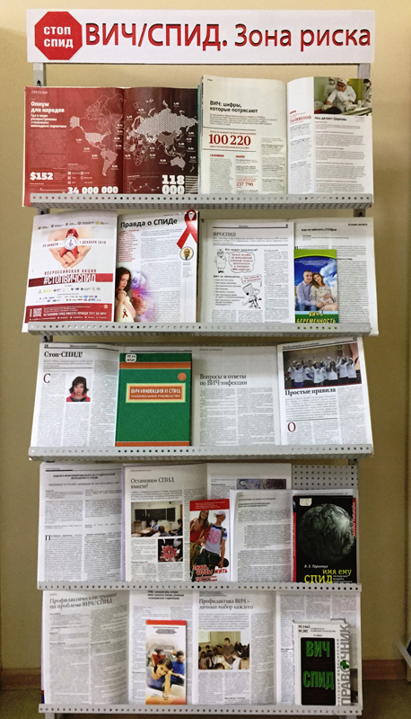 На информационной панели на 1-м этаже основного здания «Горьковки» демонстрируются: электронная презентация «Цени свою жизнь», документальный фильм «ВИЧ-урок», социальные видеоролики, приуроченные к Всемирному дню борьбы со СПИДом и Всероссийской акции «Стоп ВИЧ/СПИД». В зале периодических изданий организована выставка «ВИЧ/СПИД: зона риска», на которой можно познакомиться с информацией о способах заражения, путях передачи и мерах защиты от инфекции.