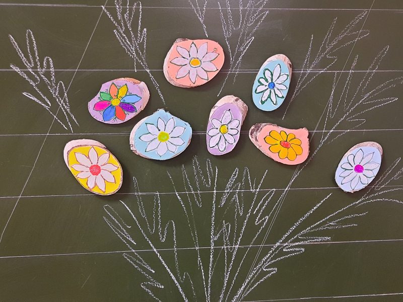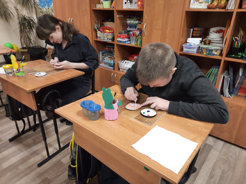 Ребята учатся в школе уже шестой год и бумажные открытки для своих любимых мам делали не один раз. В этом году решено было усложнить задачу и сделать не просто открытку, а открытку-магнит с изображением цветов, которая бы стала полноценным подарком близкому человеку. Деревянные заготовки из березовых спилов мальчишки и девчонки раскрасили белыми и цветными ромашками с помощью кисточек, ватных палочек и акриловых красок.