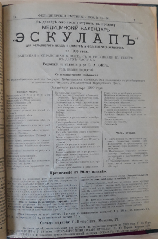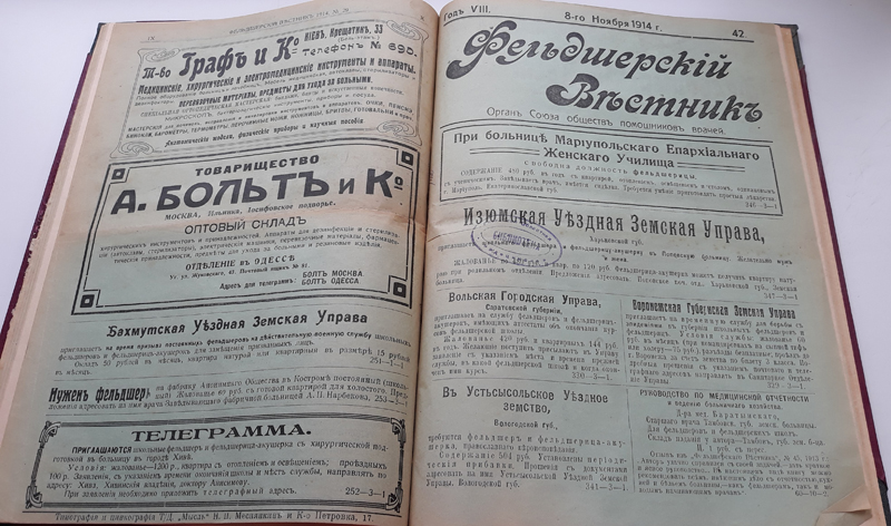 Объявления сообщали о вакансиях: врачей, фельдшеров, фельдшериц-акушерок, провизоров и аптекарских помощников. Рекламировались лекарственные препараты и лечебное питание, средства гигиены и санитарии, медицинские инструменты и оборудование. Читателей знакомили с новинками литературы и подпиской на медицинские и отраслевые периодические издания: газету «Фельдшер», «Журнал акушерства и женских болезней», «Фармацевт», «Новое в медицине», «Литературно-медицинский журнал», «Домашний доктор», «Современный мир» и другие.