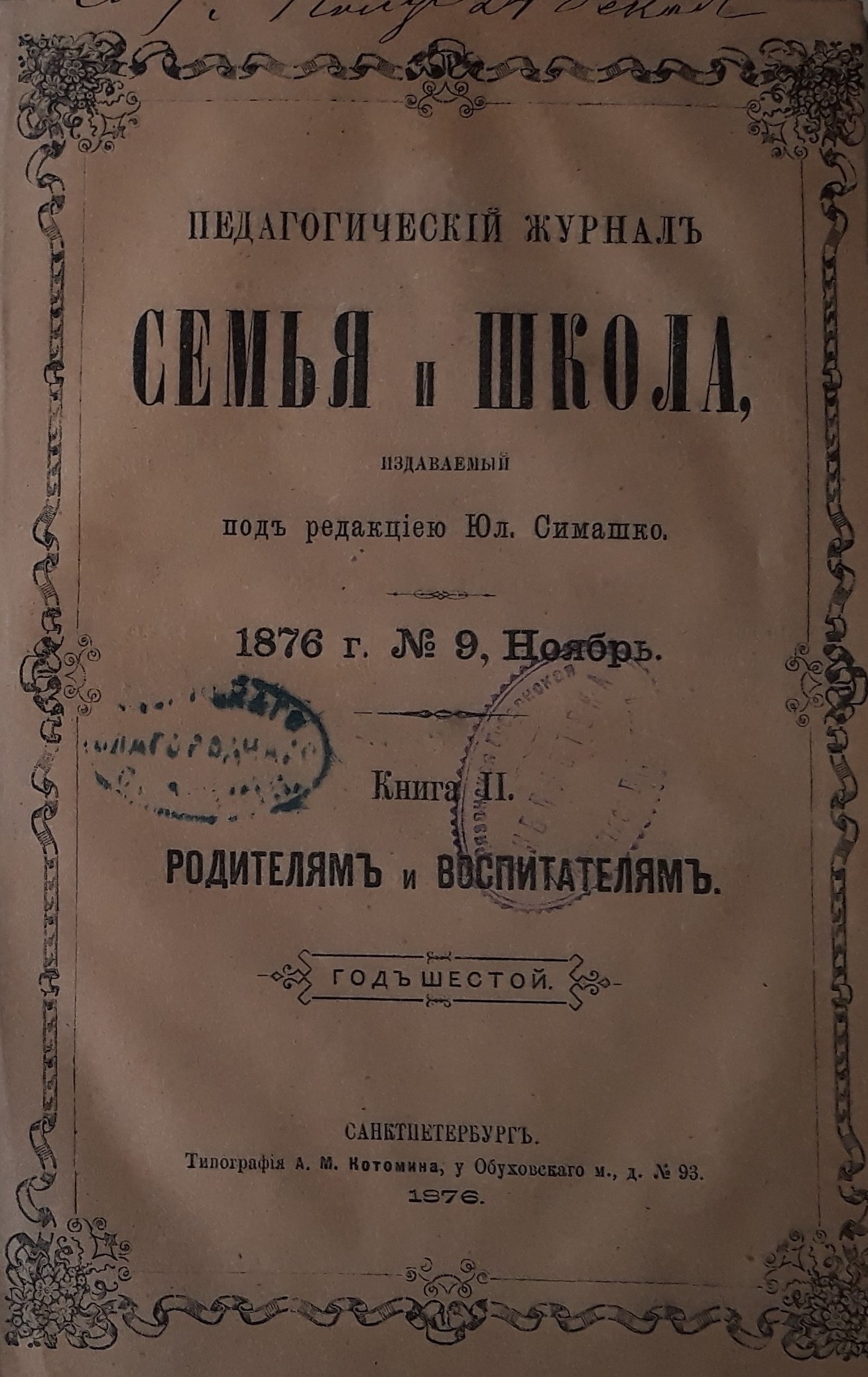 Знакомство с журналом будет интересно всем, кто занимается воспитанием и образованием подрастающего поколения. Любой номер – раритет, представляющий историю педагогики России XIX века.