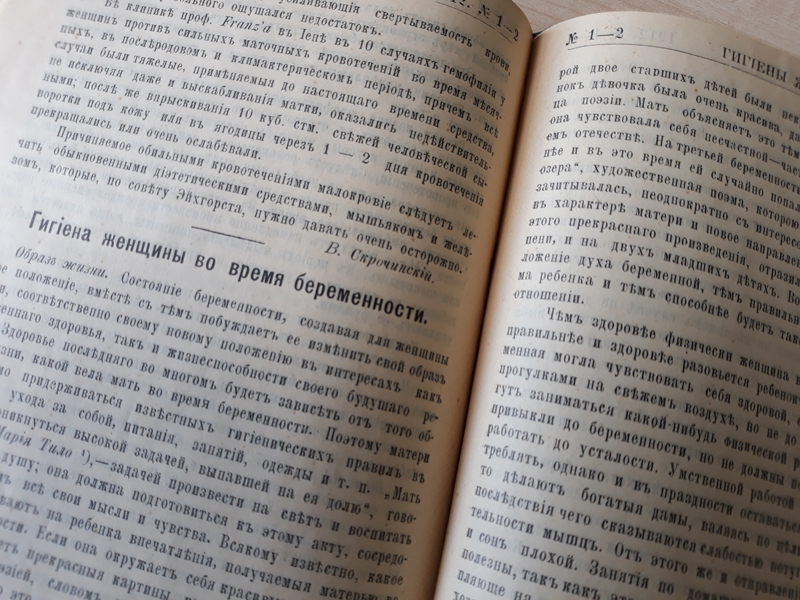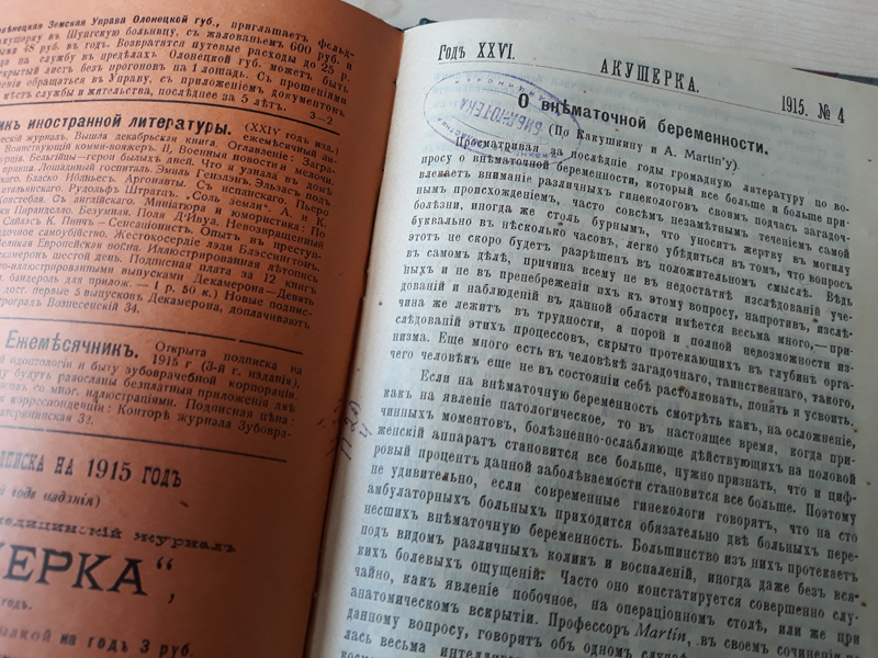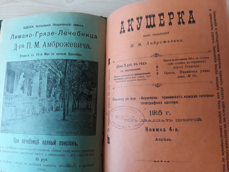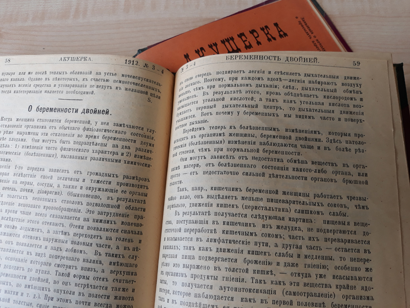 В Центре редких и ценных изданий библиотеки имени Горького хранятся отдельные номера журнала «Акушерка» за 1912–1913 и 1915 гг. Издание уникально и является большой редкостью. Спустя 130 лет со времени его основания нам представляется возможным с волнением перелистать пожелтевшие страницы, почувствовать дух той эпохи, в которой жили, трудились и творили медики. Знакомство с журналом будет интересно не только специалистам-медикам, но и всем, кто интересуется историей медицины.