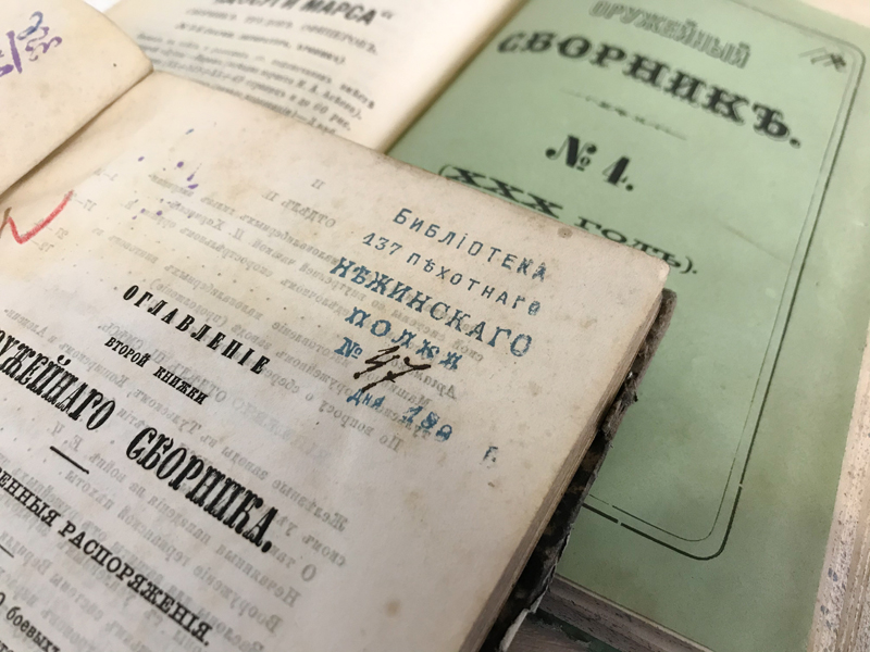 В центре редких и ценных изданий библиотеки имени Горького хранятся отдельные номера журнала за 1867–1868, 1871–1872, 1874–1875, 1881, 1883, 1890–1891, 1896, 1900, 1907–1908 года. Все экземпляры «Оружейного сборника» имеют на своих страницах экслибрисы библиотеки 137-го пехотного Нежинского полка, квартировавшегося в Рязани с 1892 года.
