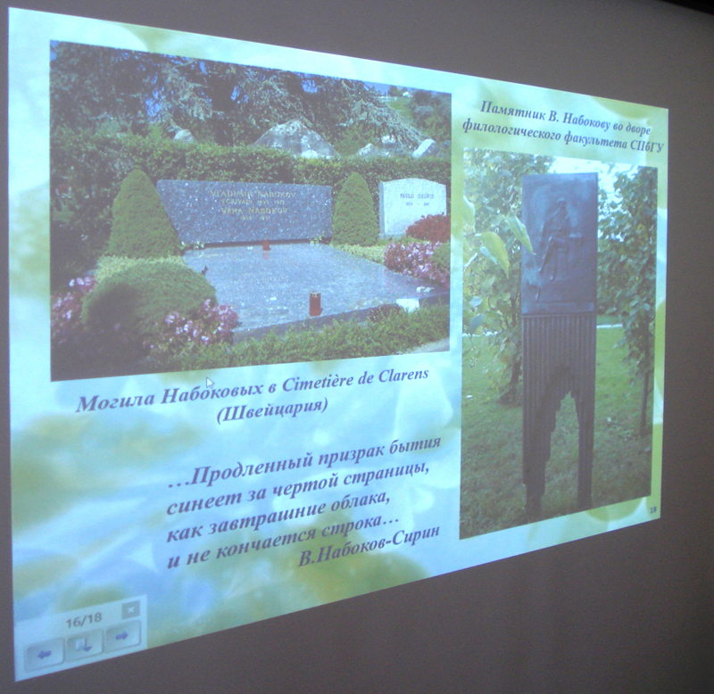 Для участников встречи прозвучали стихотворения В.Набокова разных лет. Иллюстрацией рассказа стали презентации и отрывки документальных и художественных фильмов. Медиаматериалы помогли создать портрет писателя, талантливого человека, не примирившегося с потерей Родины.