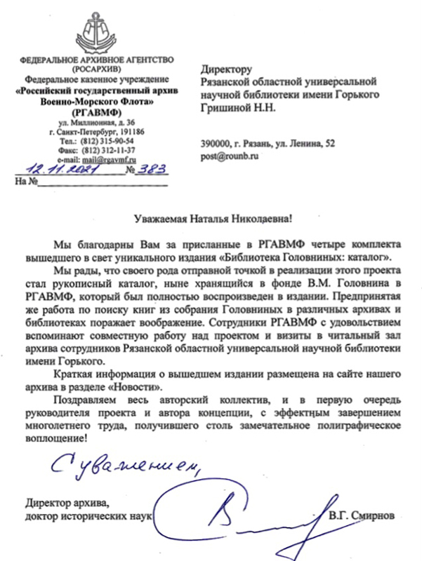 С достойным завершением многолетнего труда коллектив Горьковки поздравили сотрудники Российского государственного архива Военно-Морского Флота, поделившиеся на своем сайте новостью о публикации каталога библиотеки Головниных: https://rgavmf.ru/novosti-rgavmf/publikaciya-kataloga-biblioteki-vm-i-avgolovninyh
