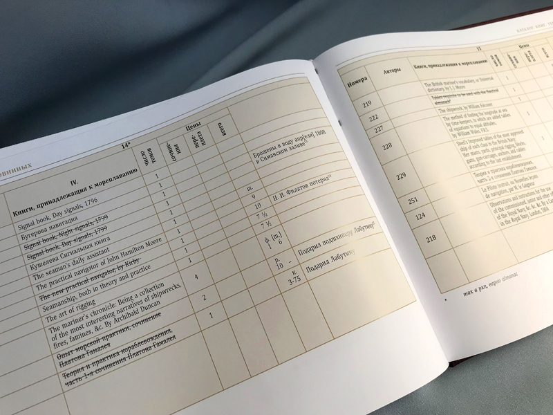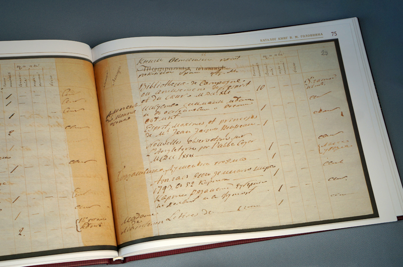 РГАВМФ хранит в своих фондах одну из самых интересных частей собрания вице-адмирала – его рукописное наследие, включающее в себя каталог книг, составленный В. М. Головниным в первой четверти XIX века. Значение этого документа в деле реконструкции трудно переоценить: это важнейший источник сведений по истории формирования библиотеки мореплавателя, путях ее пополнения и рассеивания, тематическом составе. Каталог содержит богатый материал для изучения жизни и деятельности В. М. Головнина, его дружеских и профессиональных связей и убедительно доказывает, что книги были неизменными спутниками вице-адмирала даже в самых отдаленных уголках земли. Факсимиле рукописи и ее расшифровка опубликованы нами в отдельном томе, дополняющем сводный каталог. Приобрести издание можно в нашем интернет-магазине: https://rounb.ru/news/biblioteka-golovninyh-katalog