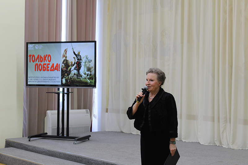 Галина Ганина подготовила яркое, содержательное, насыщенное интересной информацией мероприятие. Были представлены исторические сведения, фотографии, картины, видеосюжеты, позволившие масштабно раскрыть значение М.Д. Скобелева в российской истории, его полководческий талант, ратные победы во имя Отечества.