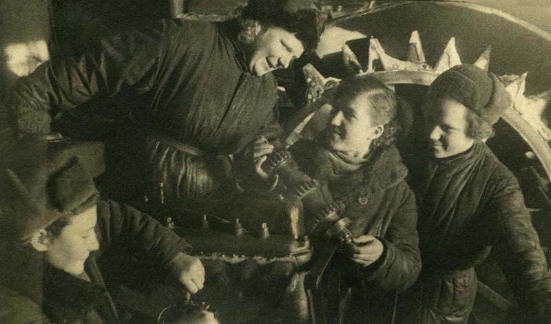 Фото «Женская тракторная бригада Гармаш Д.М. в мастерской. 1942 г.» из фондов