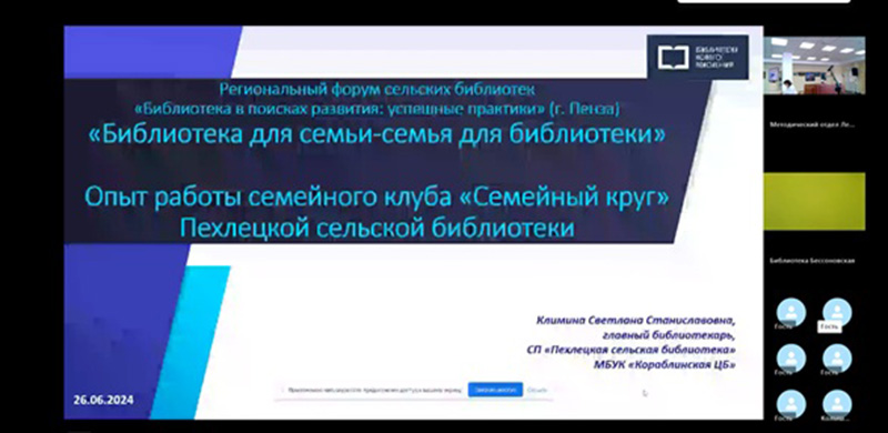 В мероприятии приняли участие руководители муниципальных библиотек Пензенской области и библиотечные специалисты, работающие в сельской местности. Опытом работы поделились участники форума из Рязанской области. Мария Юрьевна Мякова, директор Центральной районной библиотеки им. Б.А. Можаева Пителинского района, выступила с докладом «Новая библиотека – импульс к новым формам работы». Наталья Михайловна Давыдова, главный библиотекарь, исполняющий обязанности руководителя Ижевской сельской библиотеки Спасского района, рассказала о работе точки концентрации талантов «Гений места», показав презентацию «Сельская библиотека – площадка для развития креативных индустрий». Успешную практику работы в Год семьи представила Светлана Станиславовна Климина, главный библиотекарь Пехлецкой сельской библиотеки Кораблинского района в своём докладе «Библиотека для семьи – семья для библиотеки».